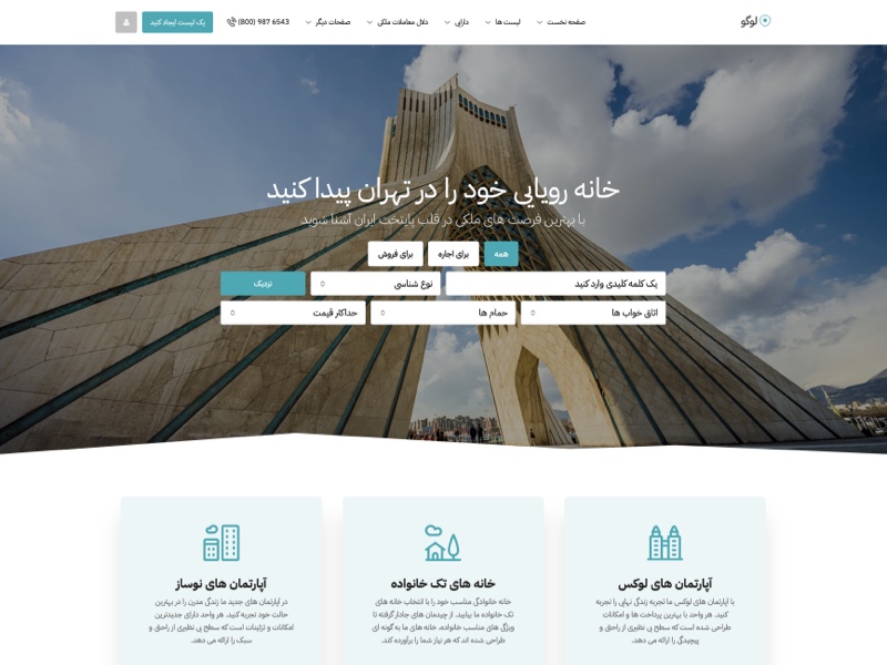 This menu tab features multiple search bar styles and placements built to help visitors easily find properties with precision and style.